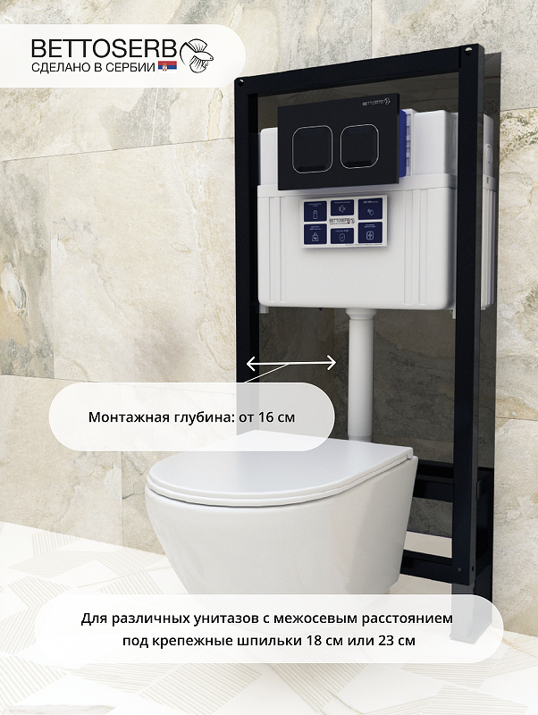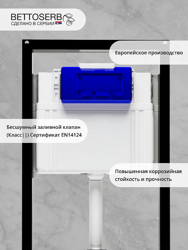 Система инсталляции для унитаза Bettoserb Free Standing в комплекте с клавишей смыва – это европейское качество и надежность, подтвержденные тестами и сертификатами. Инсталляция крепится к полу и выдерживает до 400 кг. Система подходит практически к любым подвесным унитазам и благодаря межосевому расстоянию под крепежные шпильки 18 и 23 см. Благодаря регулируемой высоте вы можете установить инсталляцию на неровную поверхность. • Надежный механизм активации смыва. Более 200 000 циклов нажатий на кнопку • Подключение к водоснабжению: верхняя средняя/правая сторона • Звукоизолирующая прокладка, бесшумный смыв • Тихий заправочный клапан • Значительная экономия воды • Рама подвесной инсталляции защищена порошковой окраской • Бачок скрытого монтажа, полностью герметизированный от попадания конденсата • Наличие всех необходимых креплений для инсталляции в комплекте • Гарантийные обязательства • Сертифицировано в ЕС
