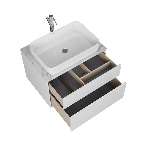 Тумба под раковину Diborg Elise 70 см, подвесная, 2 ящика, цвет белый лак, 77.7224Elise 70 так же как и все другие размеры коллекции, комплектуются столешницами глубиной 52 см с универсальными отверстиями под смеситель и выпуски. Это позволяет установить на эту коллекцию АБСОЛЮТНО ЛЮБУЮ накладную раковину. Рекомендуемые нами раковины будут представлены в прайслисте компании. Глянцевые фасады мебели - это красиво, стильно, практично и современно! Несмотря на особый изысканный акцент "блестящей" мебели, глянец нейтрален. Главное, уместно использовать в и правильно сочетать с другими материалами! Например с матовыми столешницами Elise различных цветов и оттенков.Размер (ШхВхГ): 70х44,5х52 смМонтаж: подвеснойТип крепления: Регулируемые SKARPI 4Цвет фасада: белый лакПокрытие фасада: Краска, лак белый глянецМатериал фасада: МДФЦвет корпуса: белый лакПокрытие корпуса: Краска, лак белый глянецМатериал корпуса: МДФСистема хранения: 2 ящикаМатериал, цвет внутри: Влагостойкий ЛДСП, ДубВерхний ящик: Покрытие дна графит софт тач / организация разделителя ящиков, дуб, стеклянные разделителиБельевая корзина: нетНаправляющие: Hettich Push–to–Open SilentШирина раковины: до 70 смСостав комплекта: тумба, разделители ящиков, паспорт, инструкция, гарантийный талонВес 24,88 кг